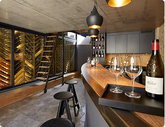 Использовано удачное контрастное сочетание деревянных и каменных элементов, создающих целостный интерьер помещения. Деревянные стеллажи, включающие секции для горизонтального и наклонного хранения, полки для вертикального размещения бутылок, а также специальные выдвижные ящики, создают пространство для большого количества вина.