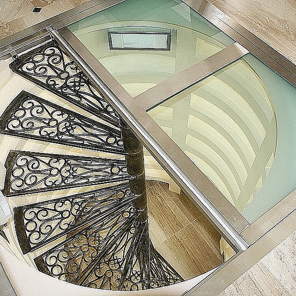 Выполненный по индивидуальному проекту винный погреб с каменными стеллажами. В создании использовалась сплит-система Friax SPC 25 USI + HGR%. Спуск в помещение хранилища организовано с помощью прозрачного напольного люка и металлической винтовой лестницы.