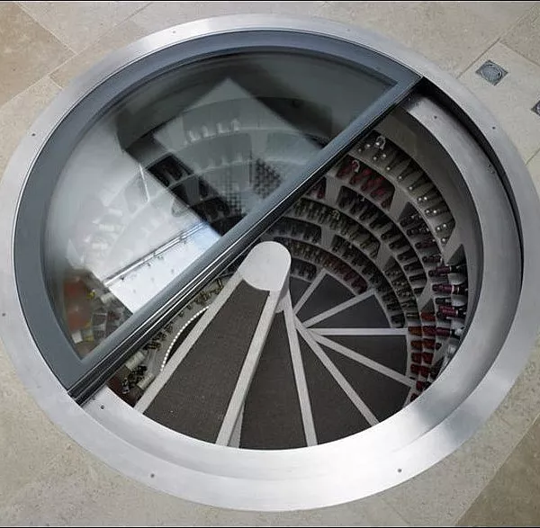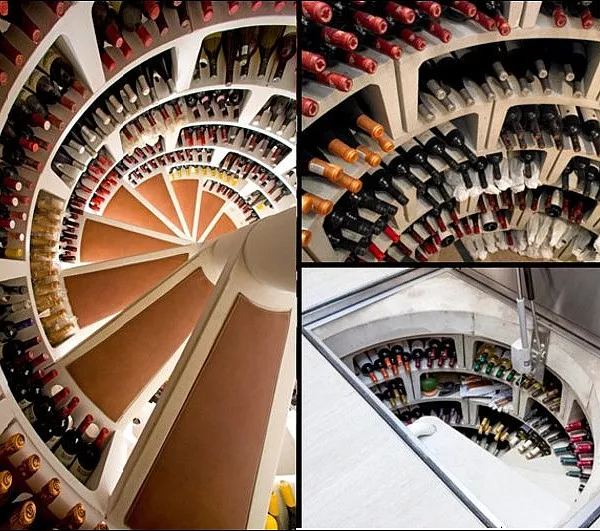 Проект винного погреба со спиральным расположением стеллажей. Вход в хранилище организован с помощью стеклянного люка и спиральной лестницы, расположенной вдоль полок с бутылками. Подобный подход позволил реализовать хранилище на небольшой площади, при этом максимально увеличив его вместительность и придав ему привлекательный красочный внешний вид.